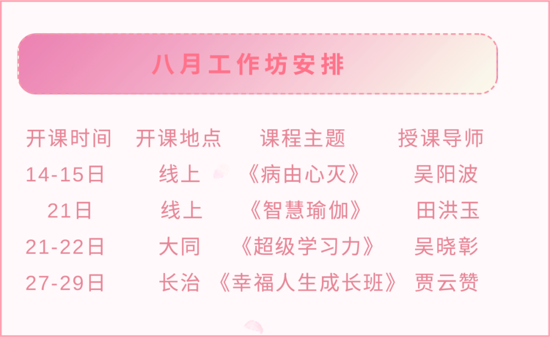 疾病因心灵而生,自然可以因心灵而灭,让我们以空杯及感恩的心态享受整整两日的课程盛宴,活在当下的同时共同期待今后精彩的人生。